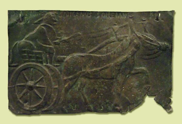 Much less common are representations of a cart drawn by mules or horses, dedicated to Epona. One, in bronze, is from Alesia (modern Alise-Ste-Reine, Côte d'Or, Bourgogne, France) [Magnen & Thévenot #4(inscription) #48 (depiction) plate 12]. It is fair to say that this would not have been recognized as an Epona had it not had a punched inscription.
