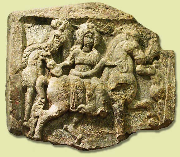 The main source of indirect evidence about Epona are several hundred statues, statuettes, bas-relifs and painted depictions of her. A few Epona representations are made of bronze; the majority are stone bas-reliefs in a variety of sizes. Moulded pipeclay Eponas are also fairly common. One Epona is known made of wood [1].