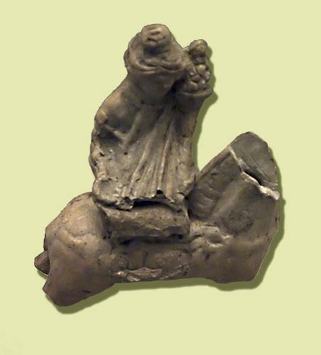 Mass-produced, moulded figures were made from white pipeclay. Inexpensive, portable and easily replaced, they were probably used in domestic lararia and while travelling. This example is from Toulon-sur-Allier [Reinach 1895 #05].